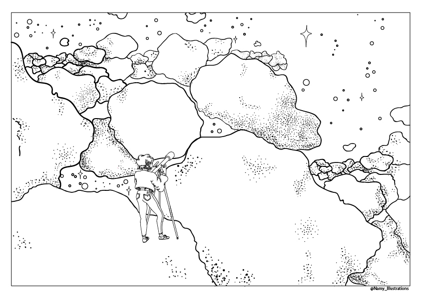 This page is an combination of two of my inktober artworks into a surrealistic image of asteroids, stars and a wanderer.